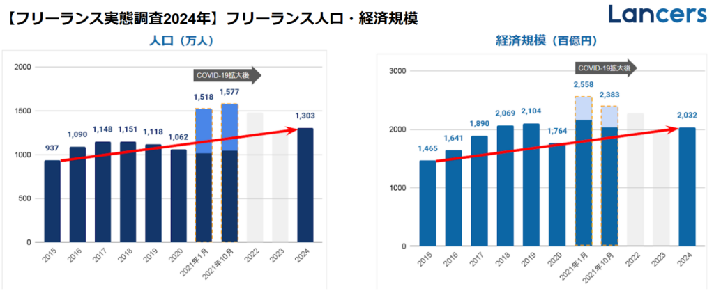ランサーズ株式会社の「フリーランス実態調査 2024」によると、2024年のフリーランス人口は1,303万人、経済規模は20兆3,200億円に達しました。2021年はコロナ禍でリモートワークが普及し、フリーランスの需要が急増しましたが、2024年はアフターコロナによる働き方の変化や生成AIの影響で減少傾向にあります。しかし、10年前と比較するとフリーランス人口は+39.1%、経済規模は+38.8%増加しており、コロナ禍という特殊要因を除くとフリーランス市場は拡大傾向にあると言えます。