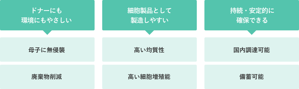 臍帯は母子の体に侵襲することなく得られるものであるため、体を傷つけることがありません。また、もともとは廃棄されていたもののため廃棄物削減にもつながります。 - 細胞製品として製造しやすい