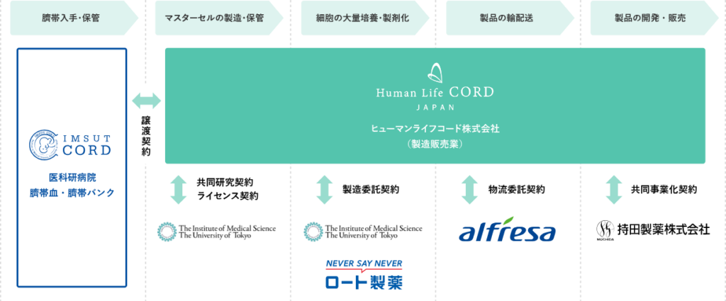 ヒューマンライフコードは、東京大学医科学研究所附属病院臍帯血・臍帯バンク (IMSUT CORD) による臍帯(へその緒)の分譲、東京大学医科学研究所との共同研究、ロート製薬株式会社、アルフレッサ株式会社への業務委託、持田製薬株式会社との共同事業化契約等、外部機関、企業とのパートナーシップのもと、原材料である臍帯(へその緒)の入手から細胞製品の製造、施設への物流に至るまで、ヒューマンライフコードが一気通貫のサプライチェーンを統括管理・運営する体制を構築しています。