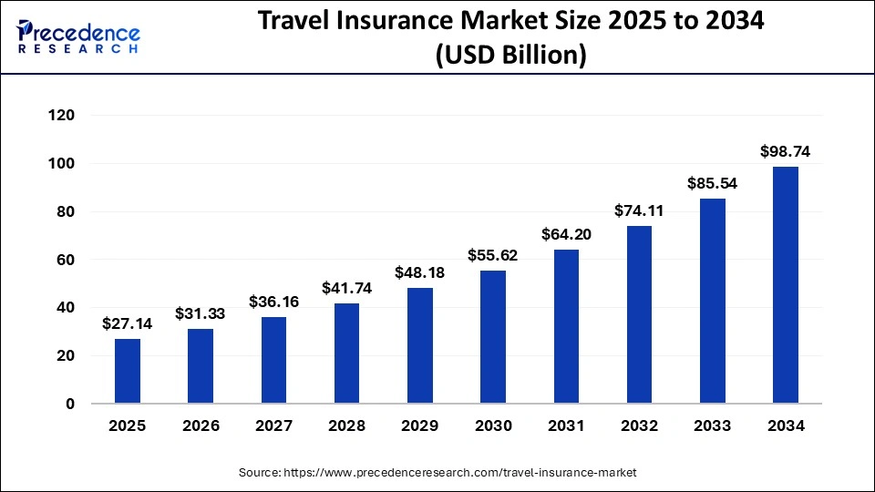 Precedence Researchによると、世界の旅行保険市場規模は2025年に約271億ドルと推計されており、2034年には約987億ドルに達する見通しです。これは年平均成長率(CAGR)15%超という非常に高い成長率であり、保険市場全体の中でも際立った成長分野といえます。