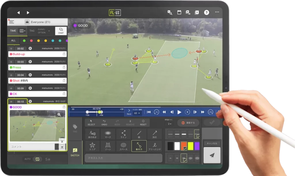 「FL‑UX」は、サッカーやバスケットボール、ラグビーなどフィールドスポーツ全般を対象としたリアルタイム戦術分析・コミュニケーションアプリです。RUN.EDGEの独自技術によるシーン検索・再生機能とタグ付け、チャット、ハイライト編集など豊富な機能が統合されています。これにより、コーチと選手は試合中や練習後の振り返りを即座に行い、戦略策定や改善点の共有が円滑に進むようになります。