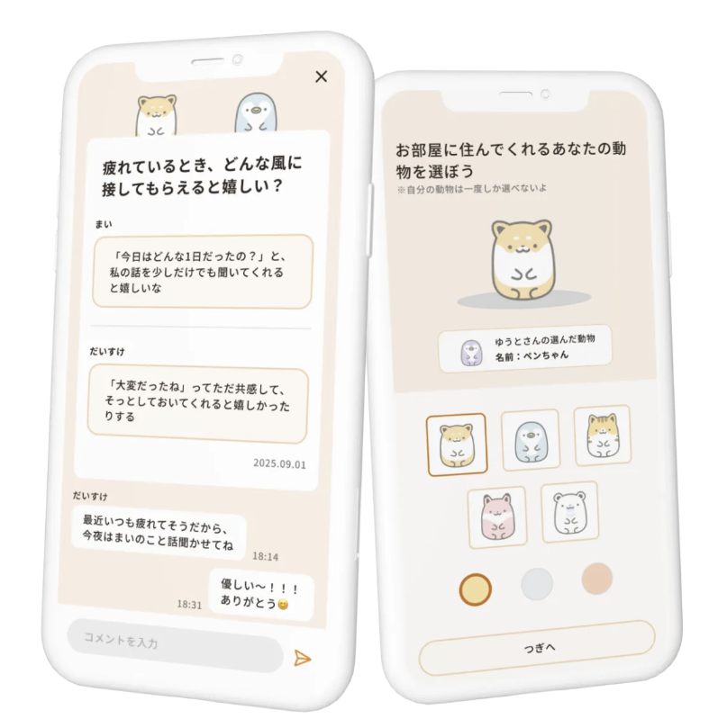 こうした問いを個人の気づきで終わらせるのではなく、誰もが日常的に使える形で社会に届けたい。その想いから、カップルや夫婦の対話を支援するプロダクトの構想が生まれ、2019年に株式会社すきだよを創業。対話のきっかけを提供する「ふたり会議」を皮切りに、関係性そのものを支えるテクノロジーの開発へと踏み出しました。