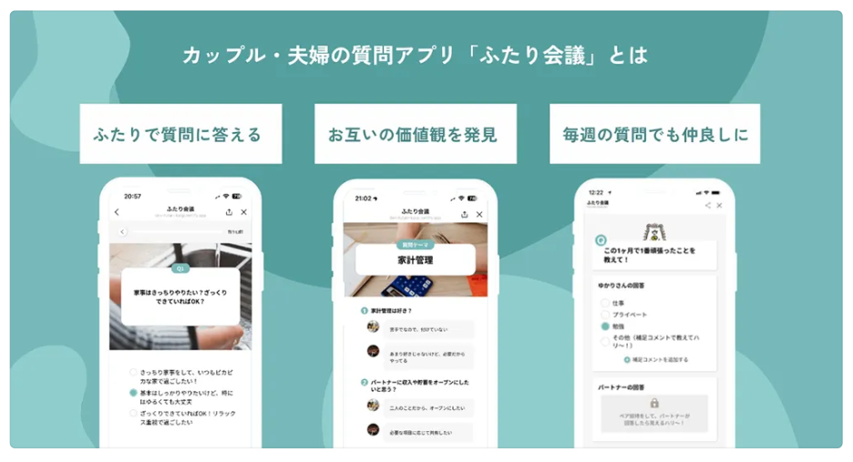 ふたり会議は、株式会社すきだよが開発・提供するカップル・夫婦向けの対話支援サービスです。