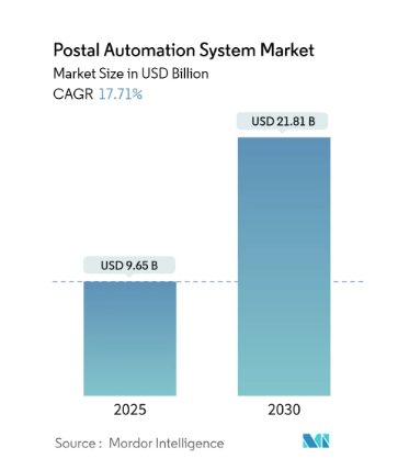 調査会社Mordor Intelligenceのデータによると、郵便自動化システムの市場規模は2025年に約96.5億米ドルに達し、2030年には218.1億米ドルまで拡大すると予測されています。