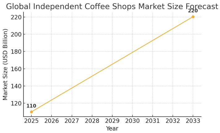 世界規模で見ると、コーヒーショップ業界は今なお巨大です。特にチェーンに属さない独立系カフェ市場は成長が著しく、2025年に約1,100億ドル(約16兆円)規模だった市場が2033年には約2,200億ドルに倍増すると予測されています。年平均成長率(CAGR)にして約7.6%という高い伸びで、消費者の嗜好が画一的なチェーン店から個性あるローカル店へシフトしていることが背景にあります。また、パンデミックを経てモバイルオーダーやデジタル決済が世界的に普及し、独立系店舗でもIT活用によるサービス向上が競争力の鍵となっています。米国ではODEKOのような飲食店DXを支援する企業が相次いで台頭し、市場全体が活性化しています。