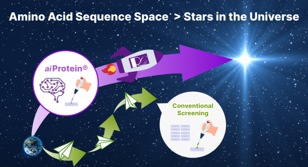 同社の「aiProtein®」は、少量の実験データからAIがタンパク質の「配列」と「機能」の相関図を予測します。これにより、広大な配列空間全体を俯瞰し、どの部分を探索すれば最も優れた機能が得られるかを精密に導き出します。
