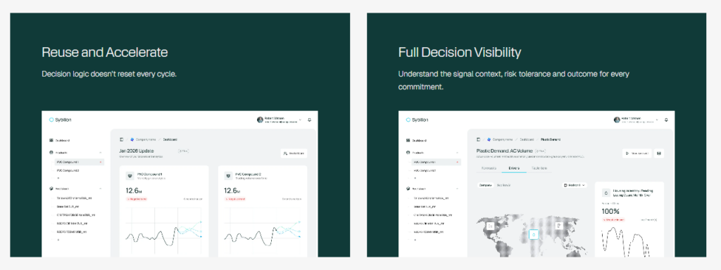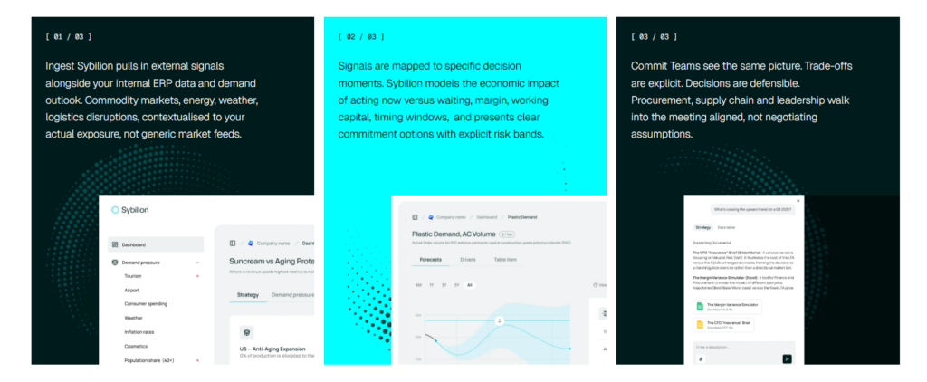 例えば、化学メーカーや繊維メーカーなどの企業においては、膨大な市場情報と供給状況を正確に把握し、最適な仕入れ計画を立てることが求められます。Sybilionは、これをAIによって支援することで、精度の高い生産計画や需要予測を実現しています。