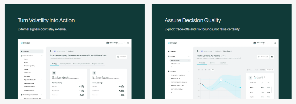 Sybilionの主力事業は、AIを活用した意思決定支援プラットフォームです。このプラットフォームは、数兆の外部データ(市場価格、天候情報、物流状況、マクロ経済指標など)をリアルタイムで分析し、企業が最適な判断を下せるよう支援します。従来の予測ツールとは異なり、Sybilionは単なる予測にとどまらず、意思決定に必要なシナリオとリスクを可視化することを目指しています。