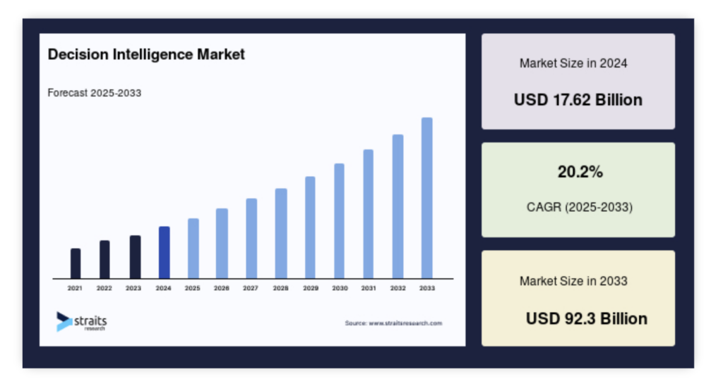 この急成長の背景には、年平均成長率(CAGR)約20.2%という高い成長率が影響しており、AI技術と意思決定支援に対する需要の高まりが市場拡大を後押ししています。