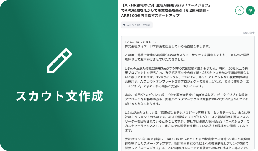 AIは、求人媒体に登録された膨大な候補者データの中から、自社にマッチする人材を精度高く抽出します 。その後、候補者一人ひとりのキャリア傾向や志向性をレジュメから読み取り、その候補者が最も興味を引くポイントを盛り込んだスカウト文章を瞬時に作成します 。これにより、従来は1通あたり15分〜30分かかっていたスカウト作成業務がわずか数秒で完了し、かつ人間が書いたかのような「心に刺さる」文面を実現します 。