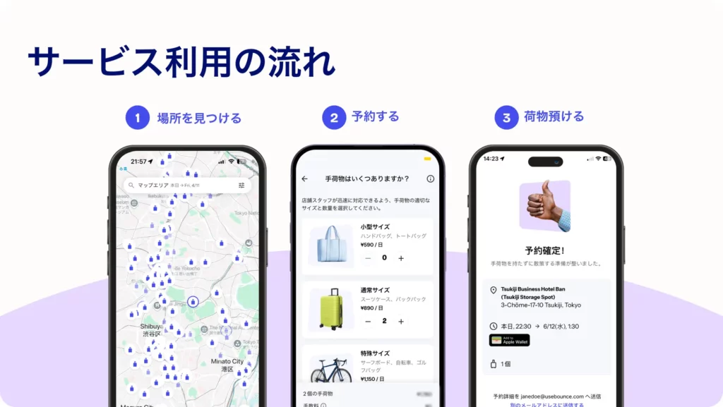 ユーザーは、専用のモバイルアプリ、またはウェブサイトを通じて、現在地付近の預かり場所をリアルタイムで検索し、予約から決済までを数タップで完了できます 。このサービスの最大の強みは、従来のコインロッカーにはない「物理的制約の打破」と「安心感の提供」にあります 。