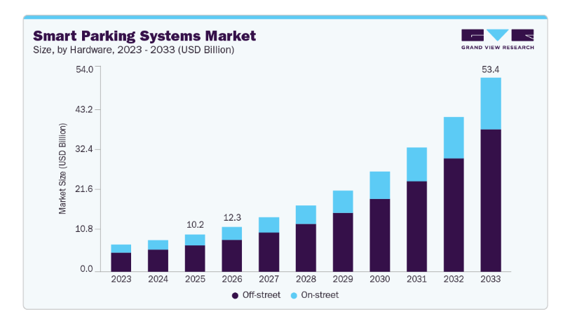 また、グラフでは市場が「On-street(路上)」と「Off-street(施設・コインパーキング)」に分かれており、特に大きいのは後者です。商業施設やコインパーキングといった民間駐車場のデジタル化が、市場全体の成長をけん引していることが読み取れます。